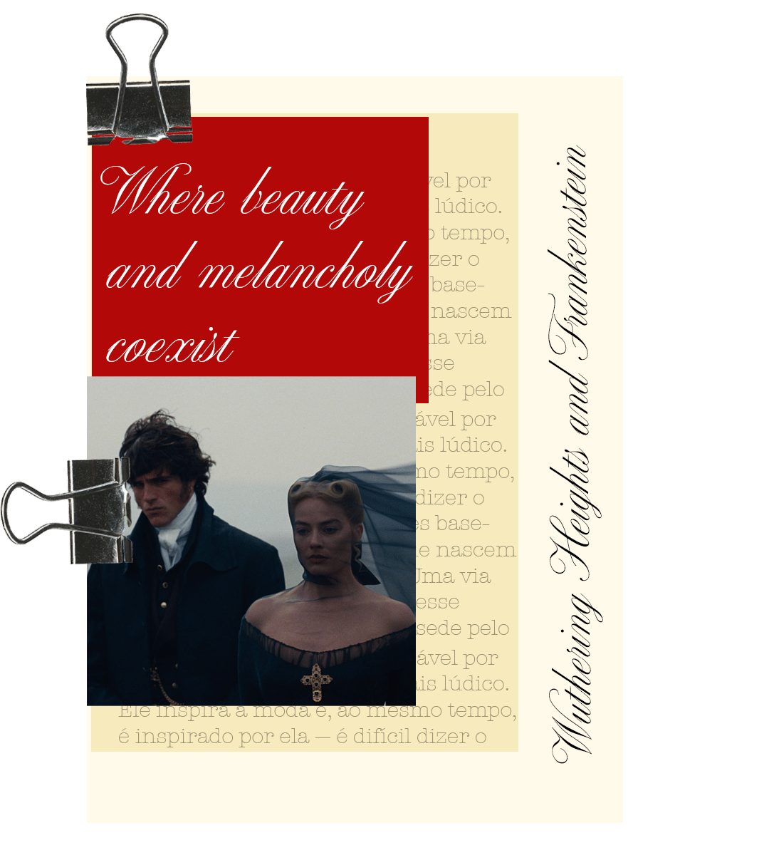 Em menos de um ano, tivemos novas adaptações de Frankenstein e O Morro dos Ventos Uivantes: duas obras góticas que atravessaram séculos influenciando literatura, cinema e estética. Como fã do gênero, quis aprofundar em como esse imaginário reaparece na moda e nos figurinos recentes.
